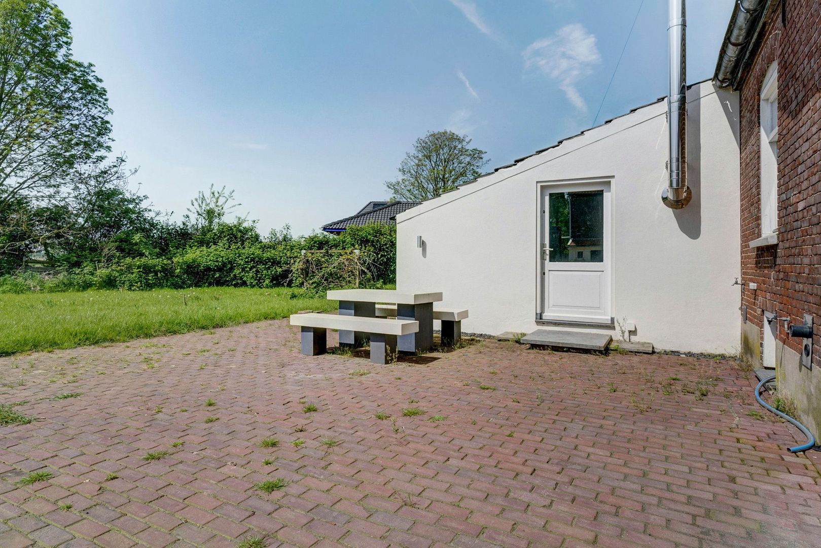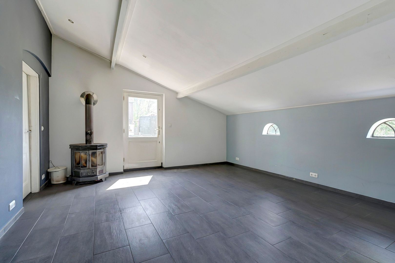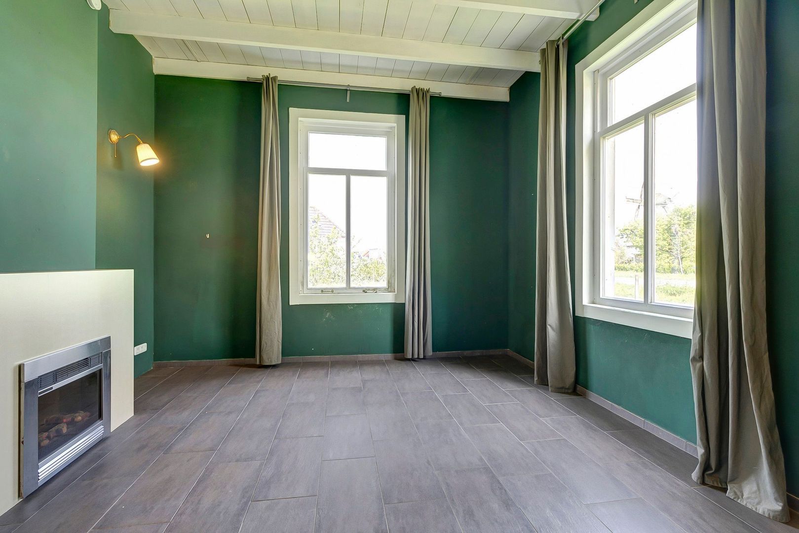 Woonkamer, voorzien van houtkachel, toegang tot tuin door middel van enkele deur.