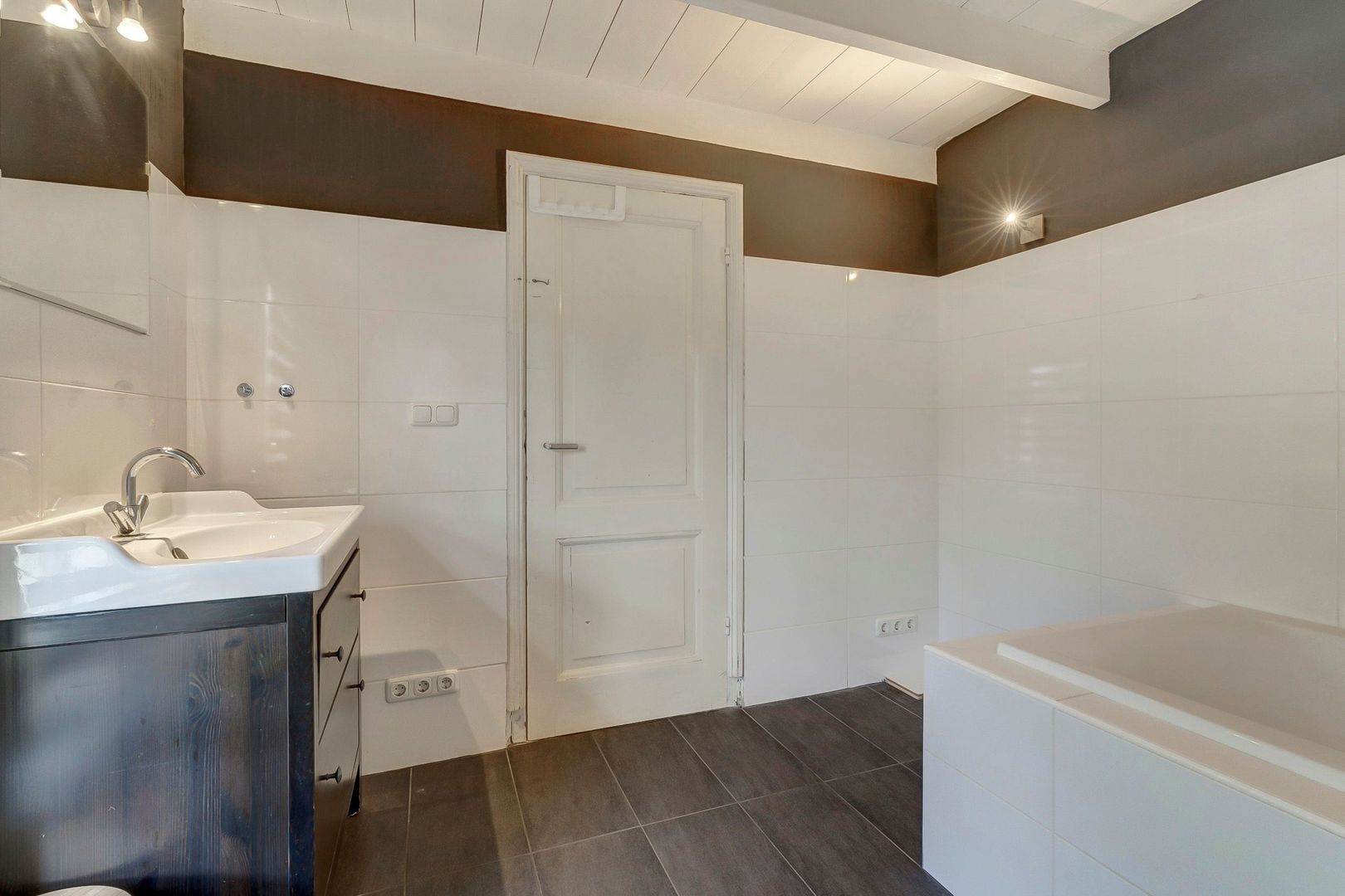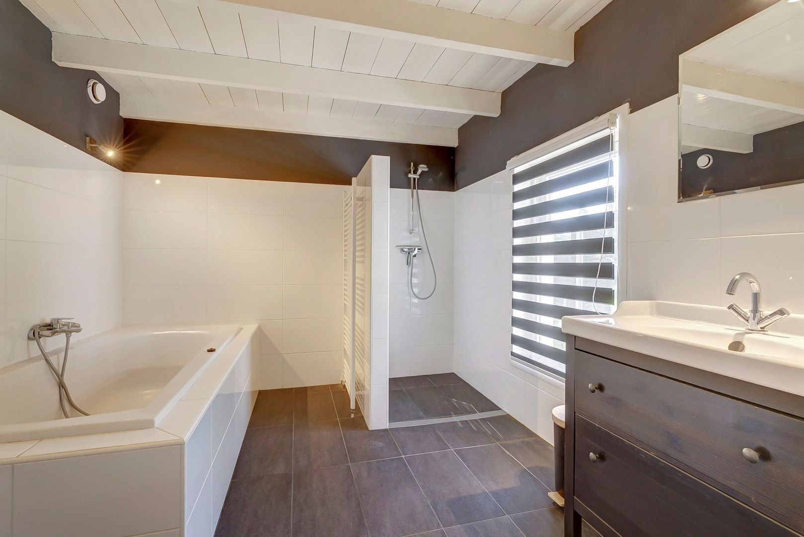 Luxe badkamer (2017) met van inloopdouche, ligbad, wastafelmeubel en designradiator.