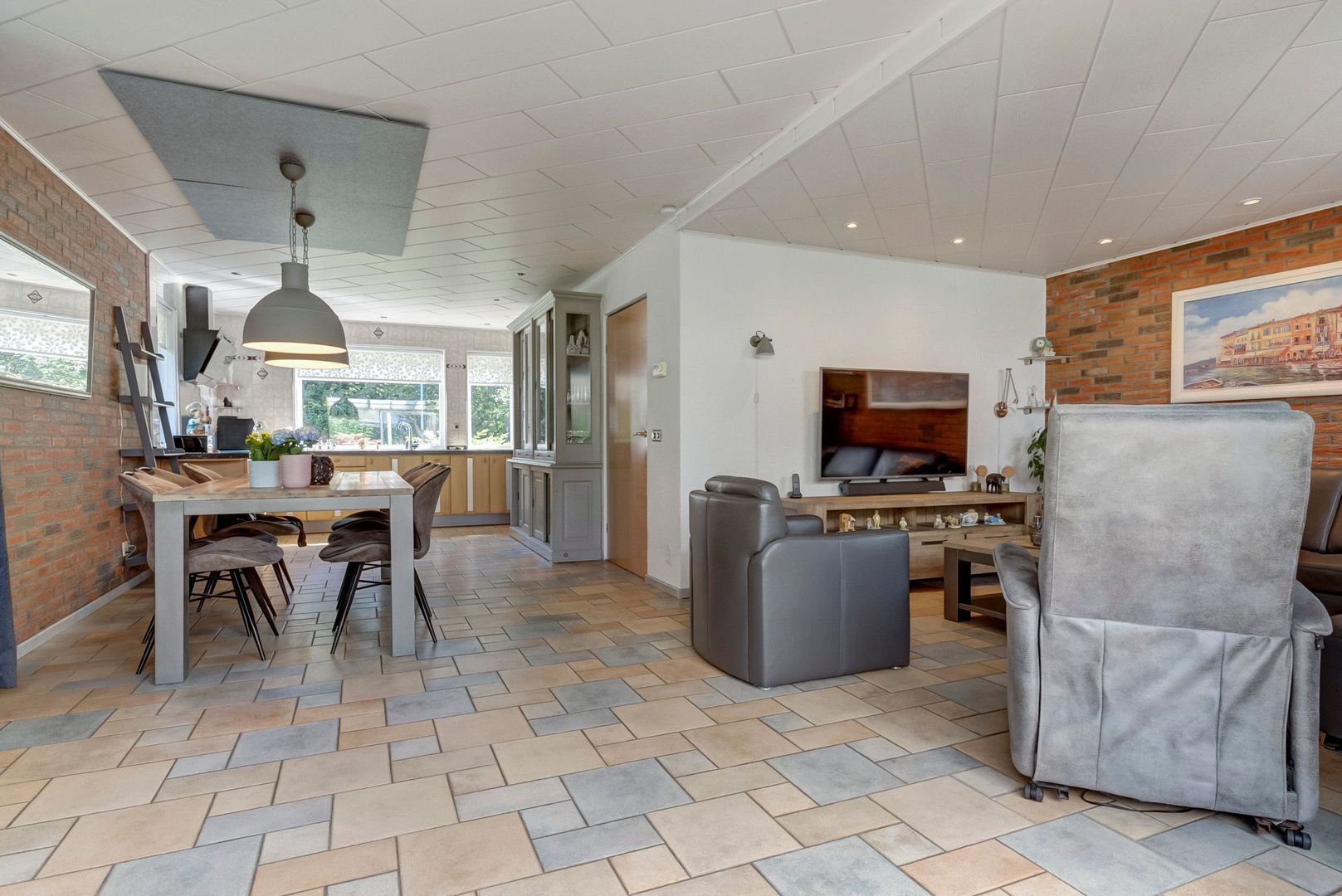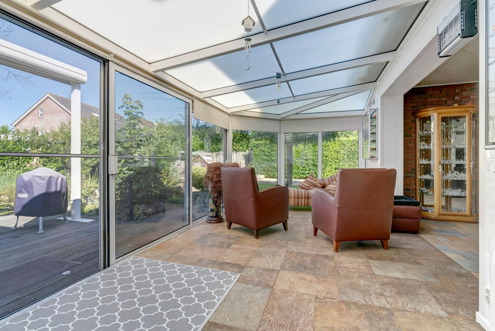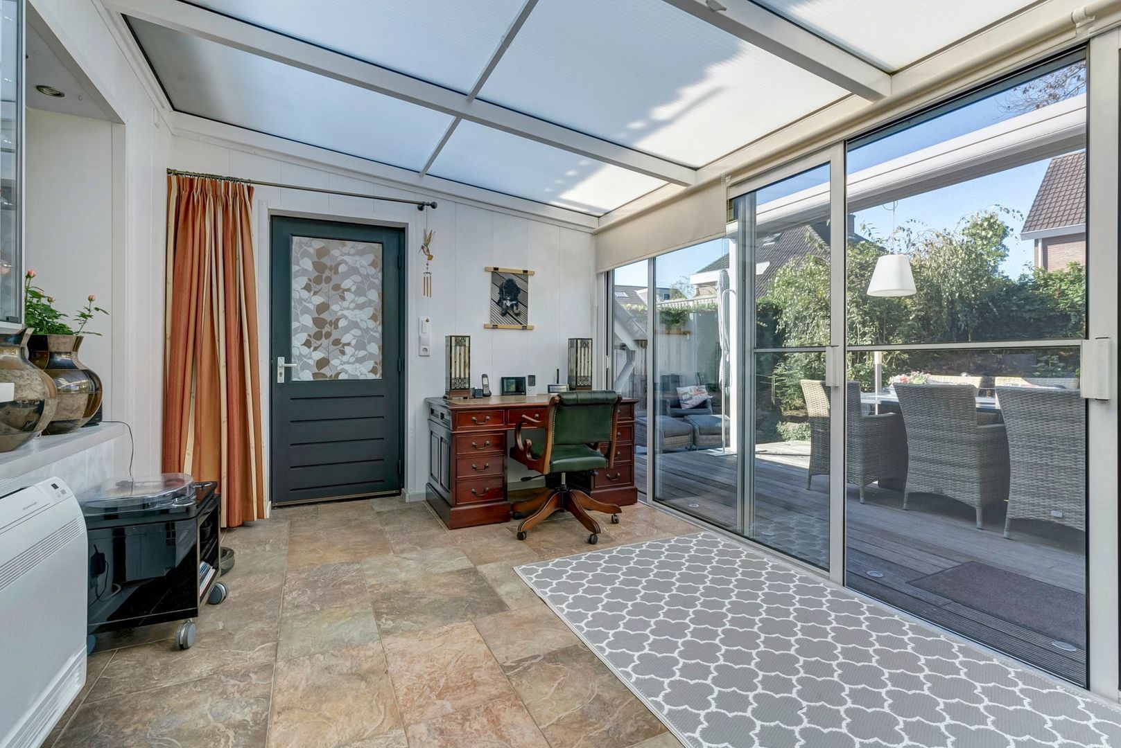 Lichte entree/hal met opgang naar boven, toilet met fontein, meterkast en toegang tot riante, zonnige woonkamer met aangebouwde serre, airco (koelen en verwarmen uit 2024), vloerverwarming en een schuifdeuren naar de tuin waardoor een doorgang van 3 meter ontstaat. Via de woonkamer toegang tot keuken.