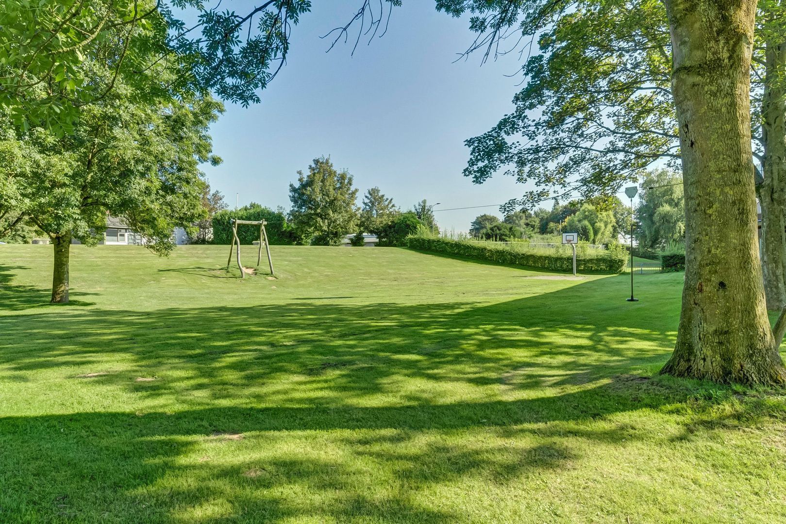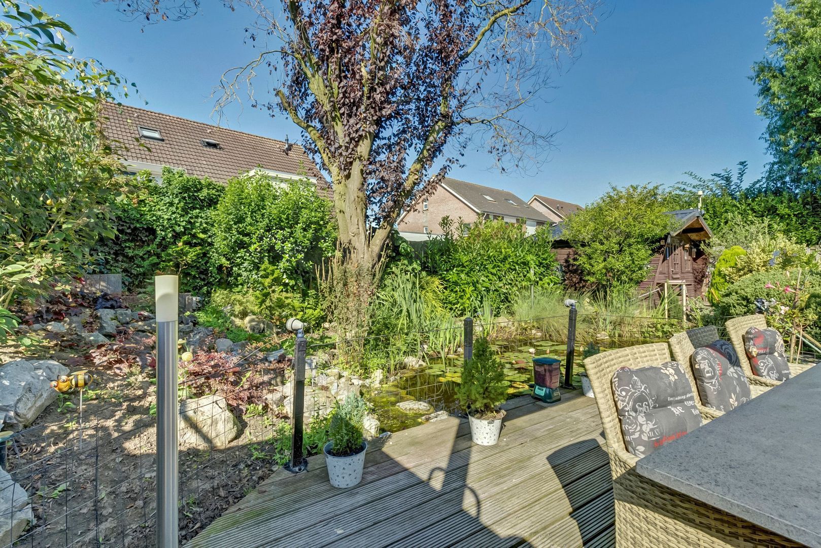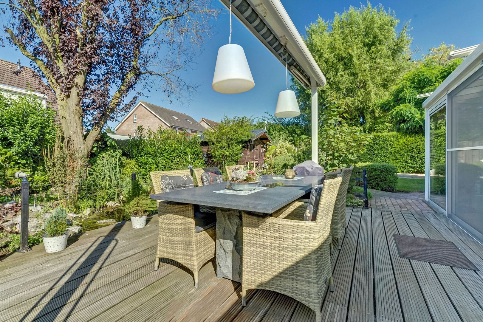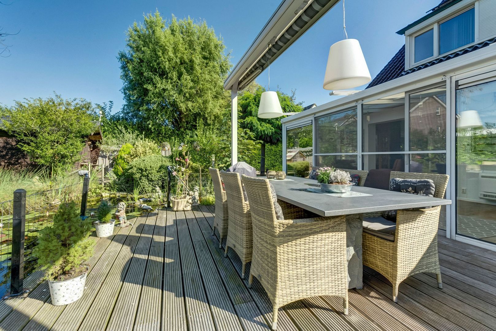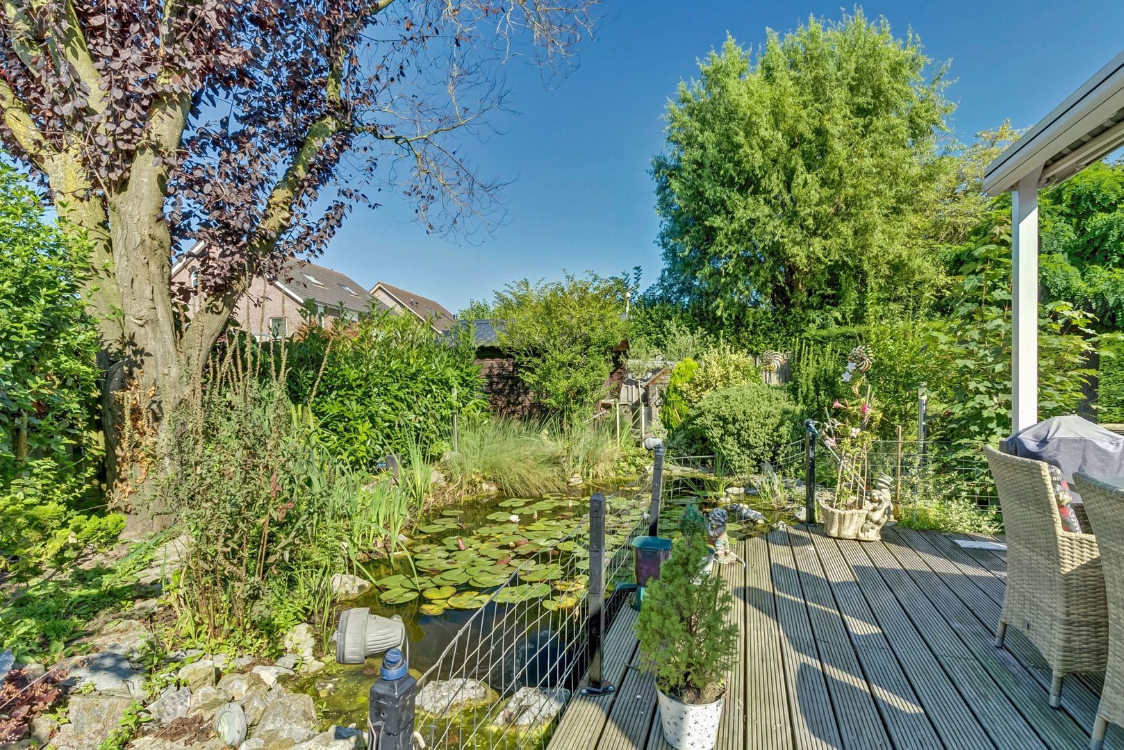 Ruime tuin met meerdere terrassen en vijver direct grenzend aan het grote terras.