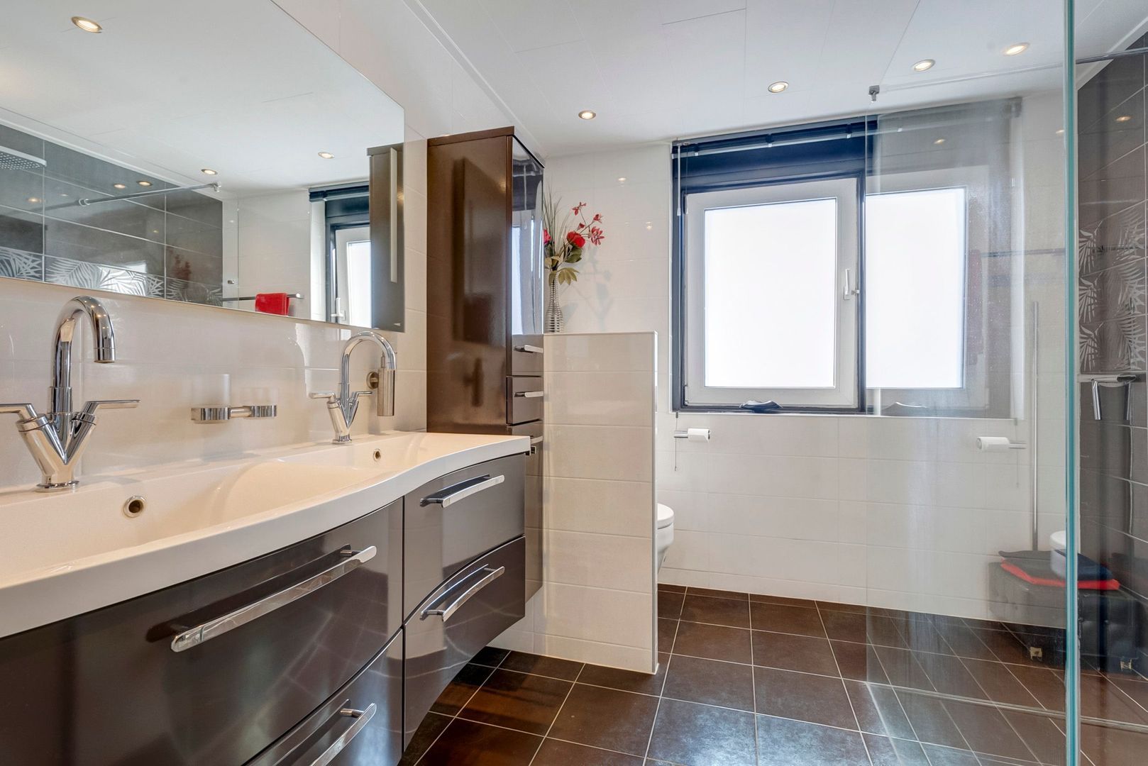 Luxe badkamer (2008) met twee wastafels inclusief meubel, douche en toilet.
