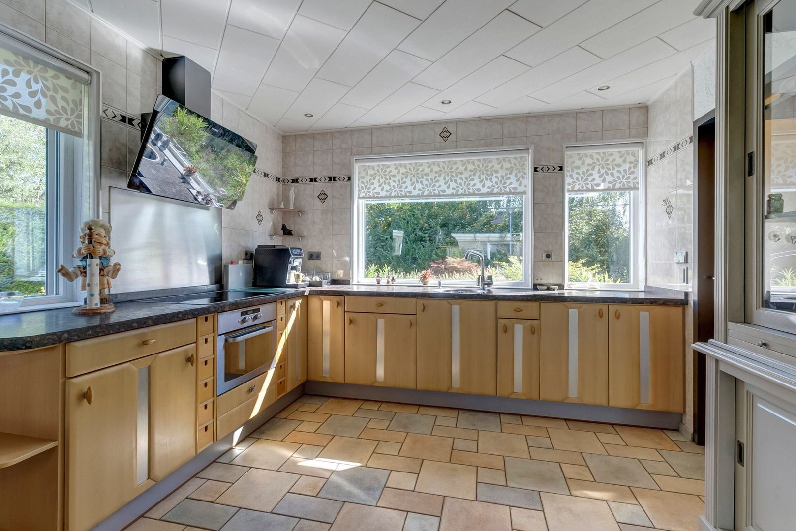 Luxe open keuken met inbouwapparatuur zoals halogeen kookplaat, afzuigkap, koelkast, oven/magnetron en natuurstenen aanrechtblad.
