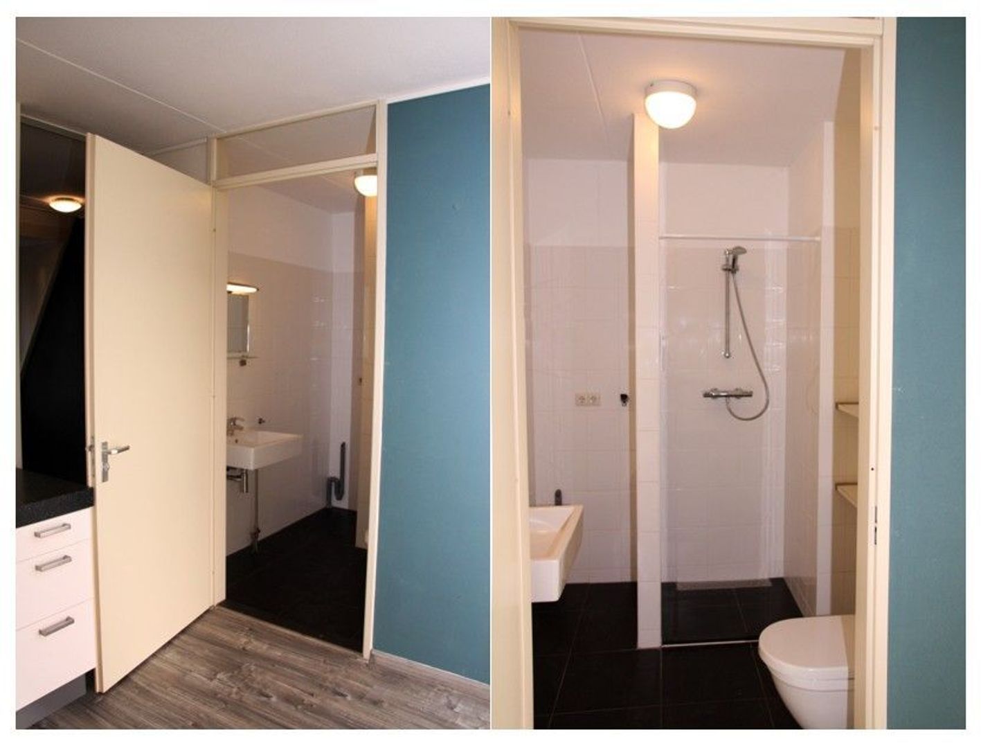 De slaapkamer beschikt over een praktische inloopkast (walk-in closet) en grenst aan de moderne badkamer, uitgerust met een luxe wastafel, inloopdouche, hangend toilet en aansluiting voor wasmachine en droger.