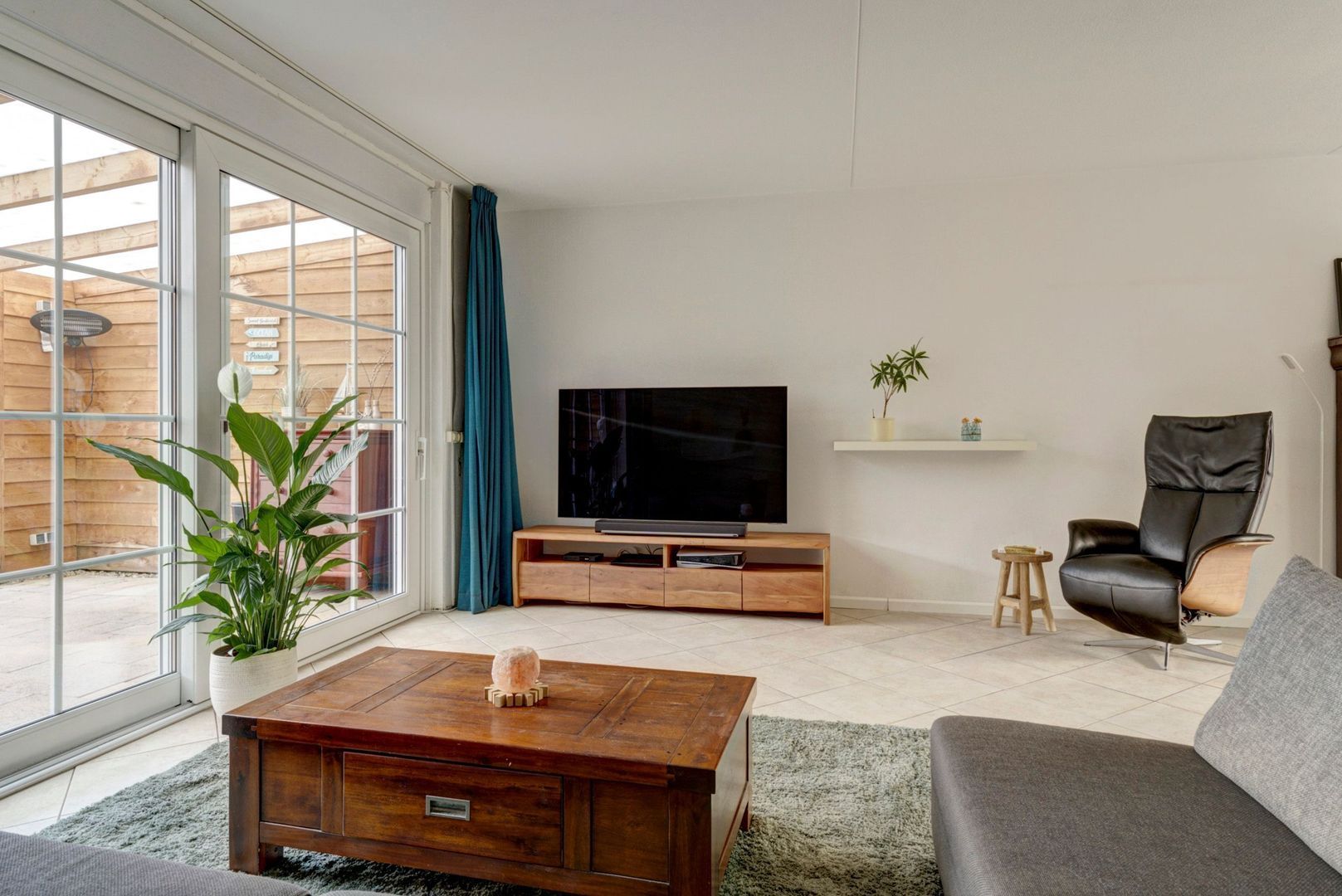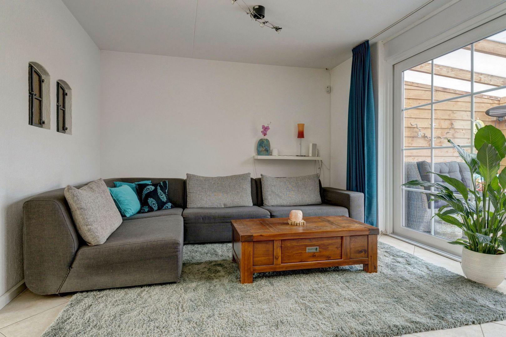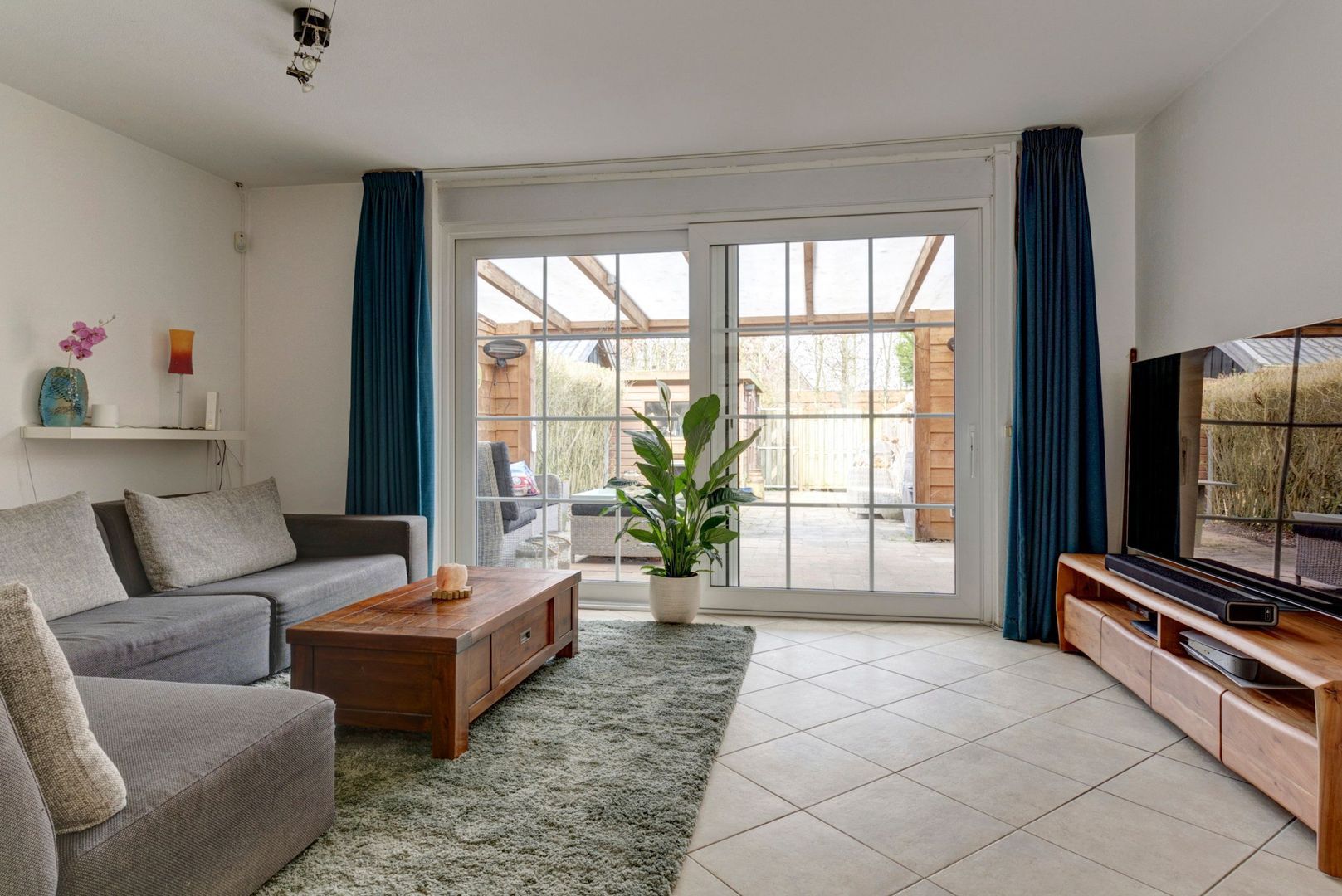 Tuingerichte L-vormige woonkamer met schuifpui naar terras.
