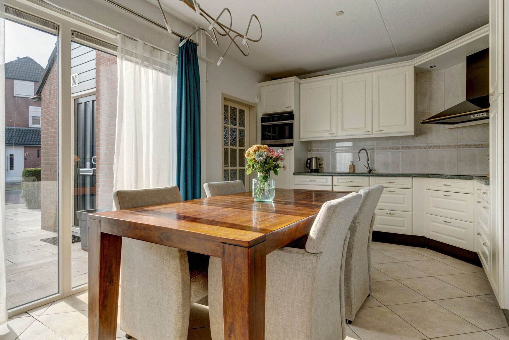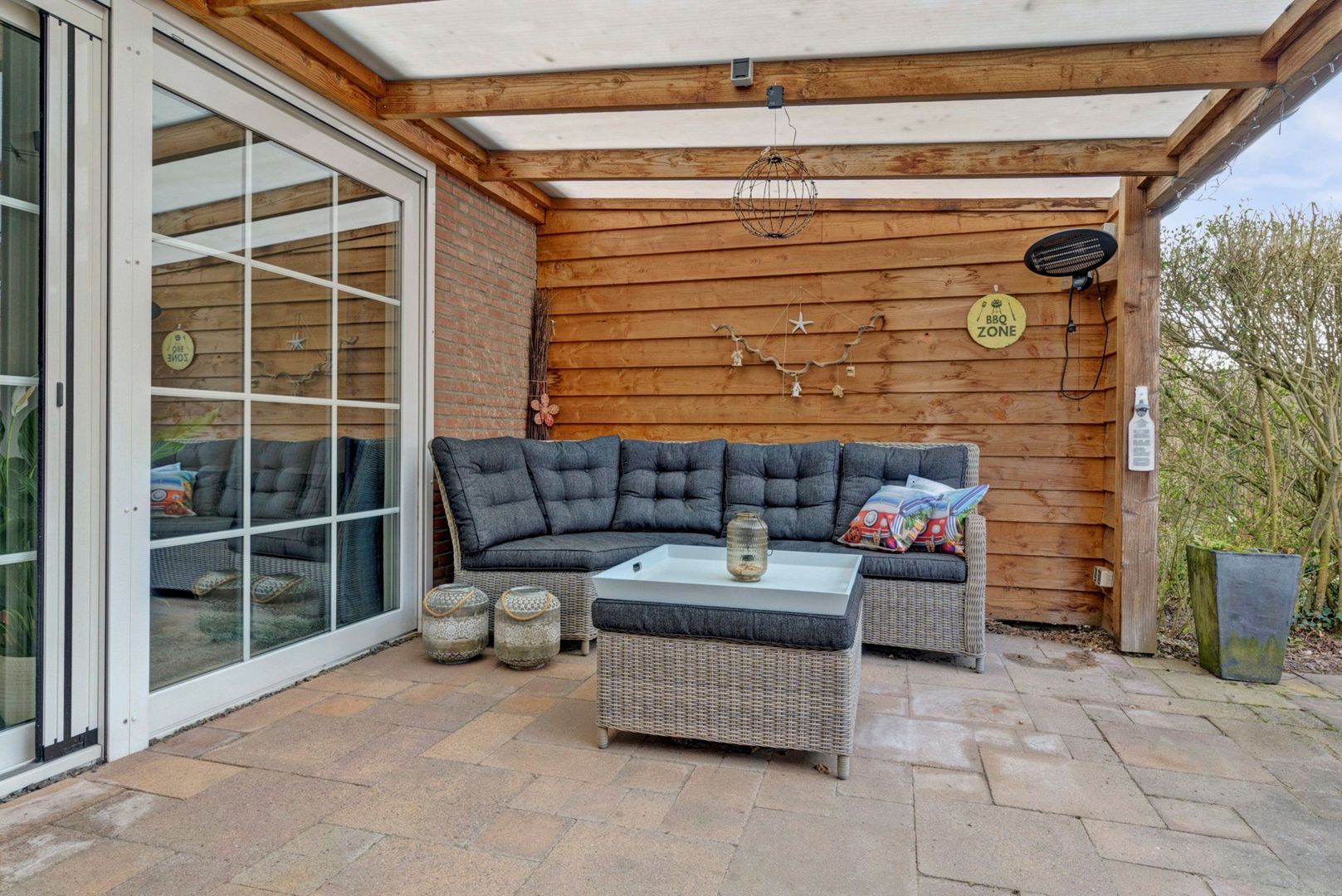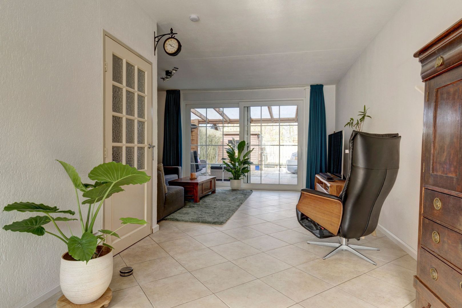 Tuingerichte L-vormige woonkamer met schuifpui naar terras.
