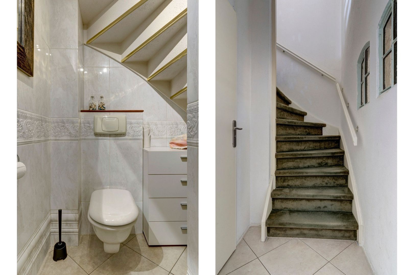 Hal met hangend toilet plus fontein en trapopgang naar de eerste etage.