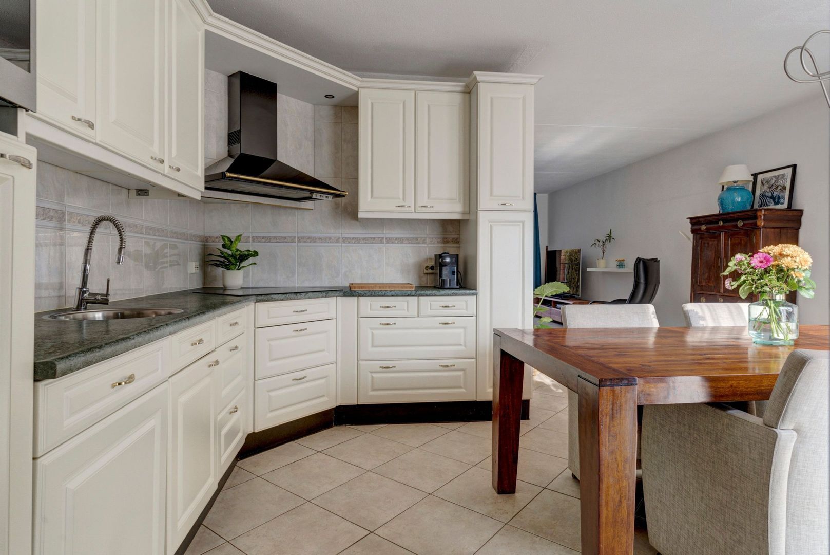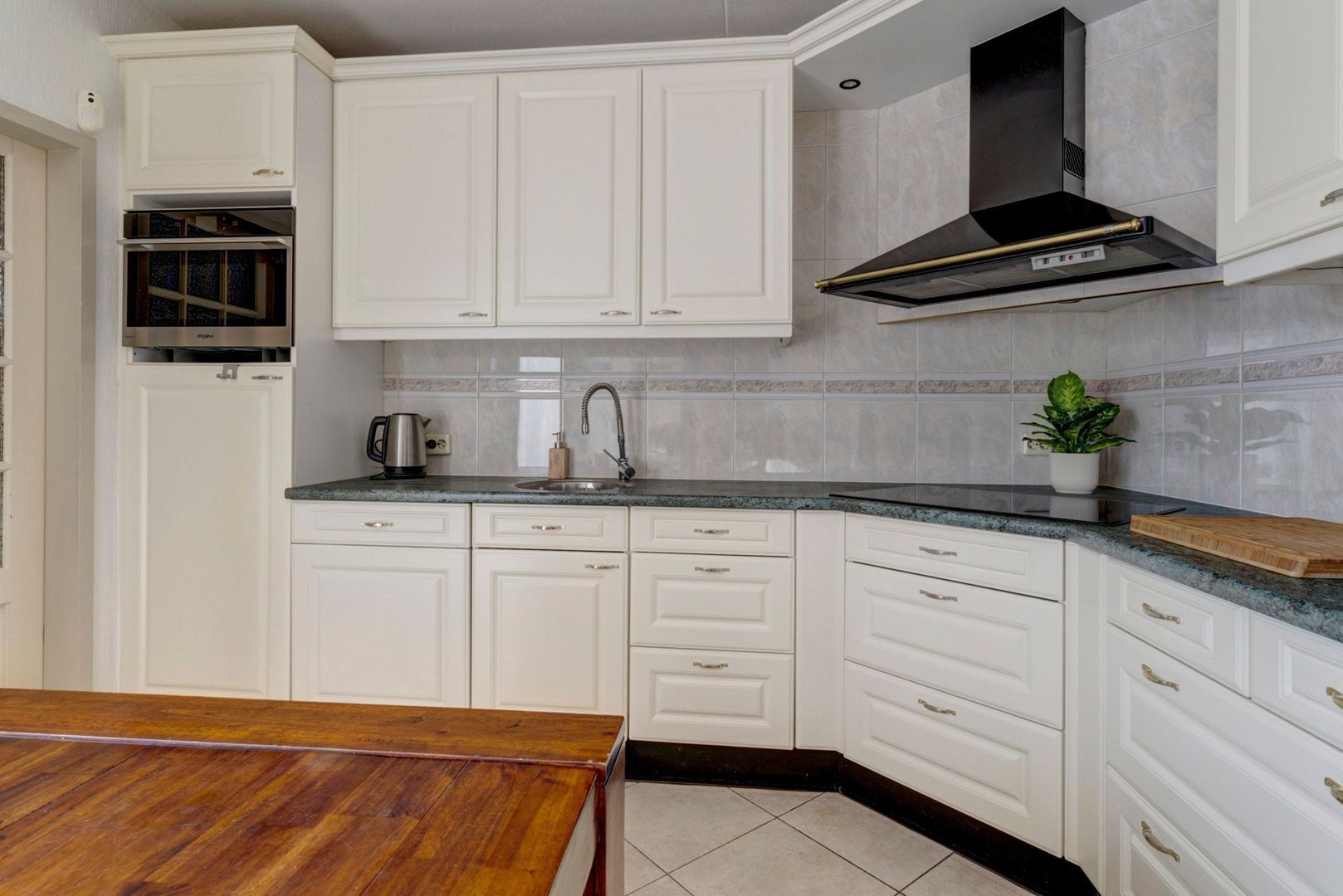 Ruime open keuken in een hoekopstelling met inbouwapparatuur zoals inductiekookplaat, afzuigkap, combimagnetron, vaatwasser en koelkast