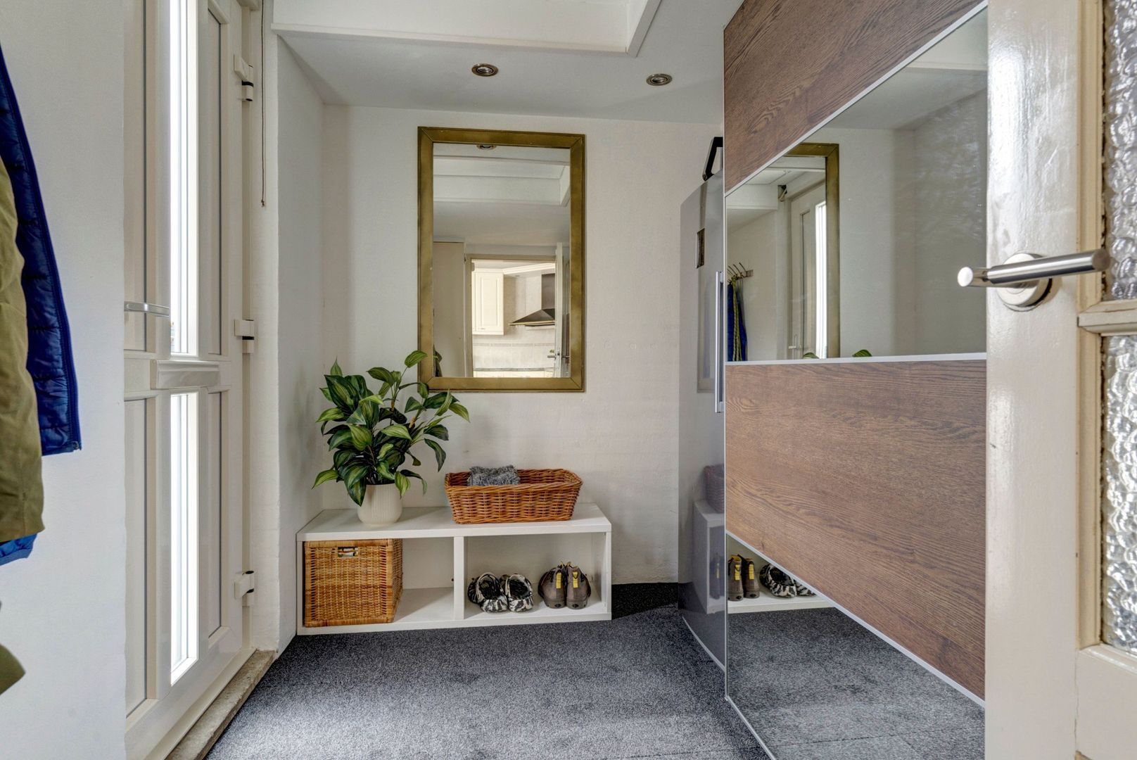 De voorgevel beneden is volledig raam gemaakt en het halletje is weg, waardoor de keuken een leef-keuken is geworden met veel meer lichtinval dan bij vergelijkbare huizen.