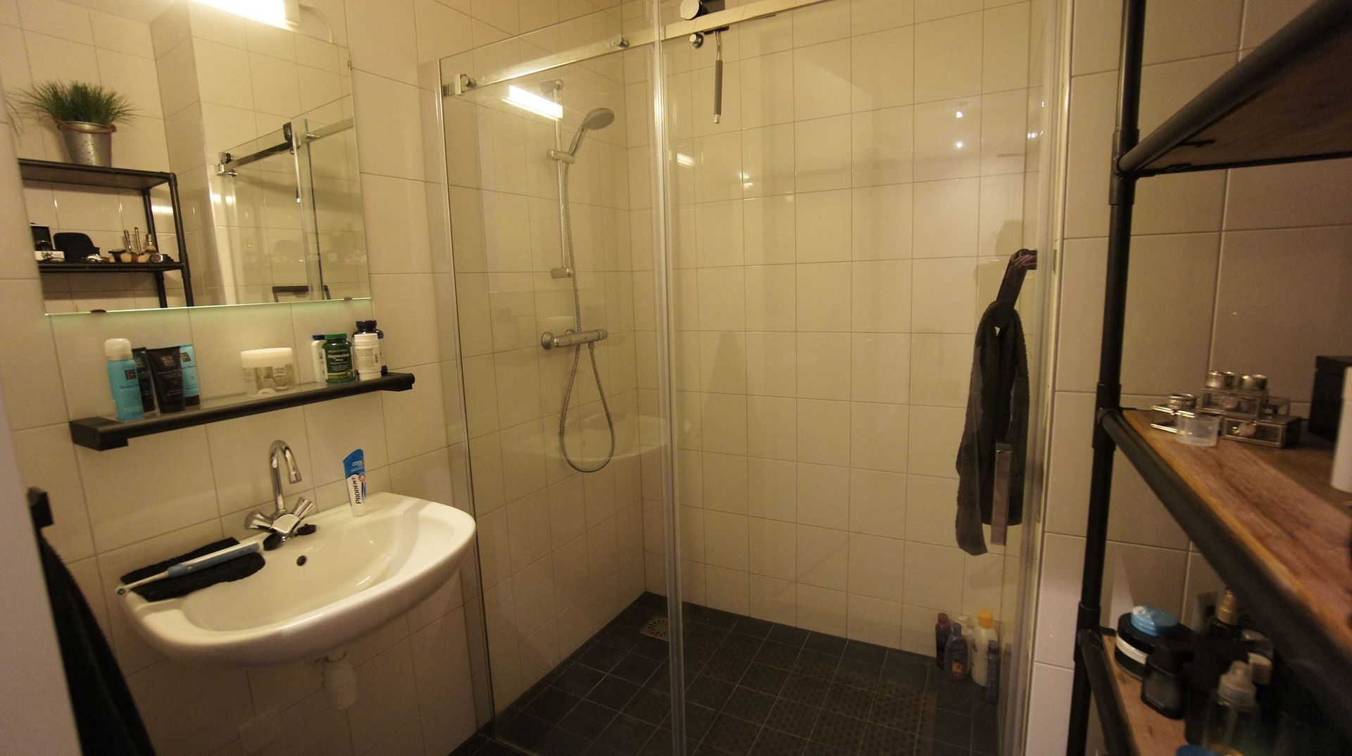 Badkamer met douche, wastafel, aansluiting voor de wasmachine.