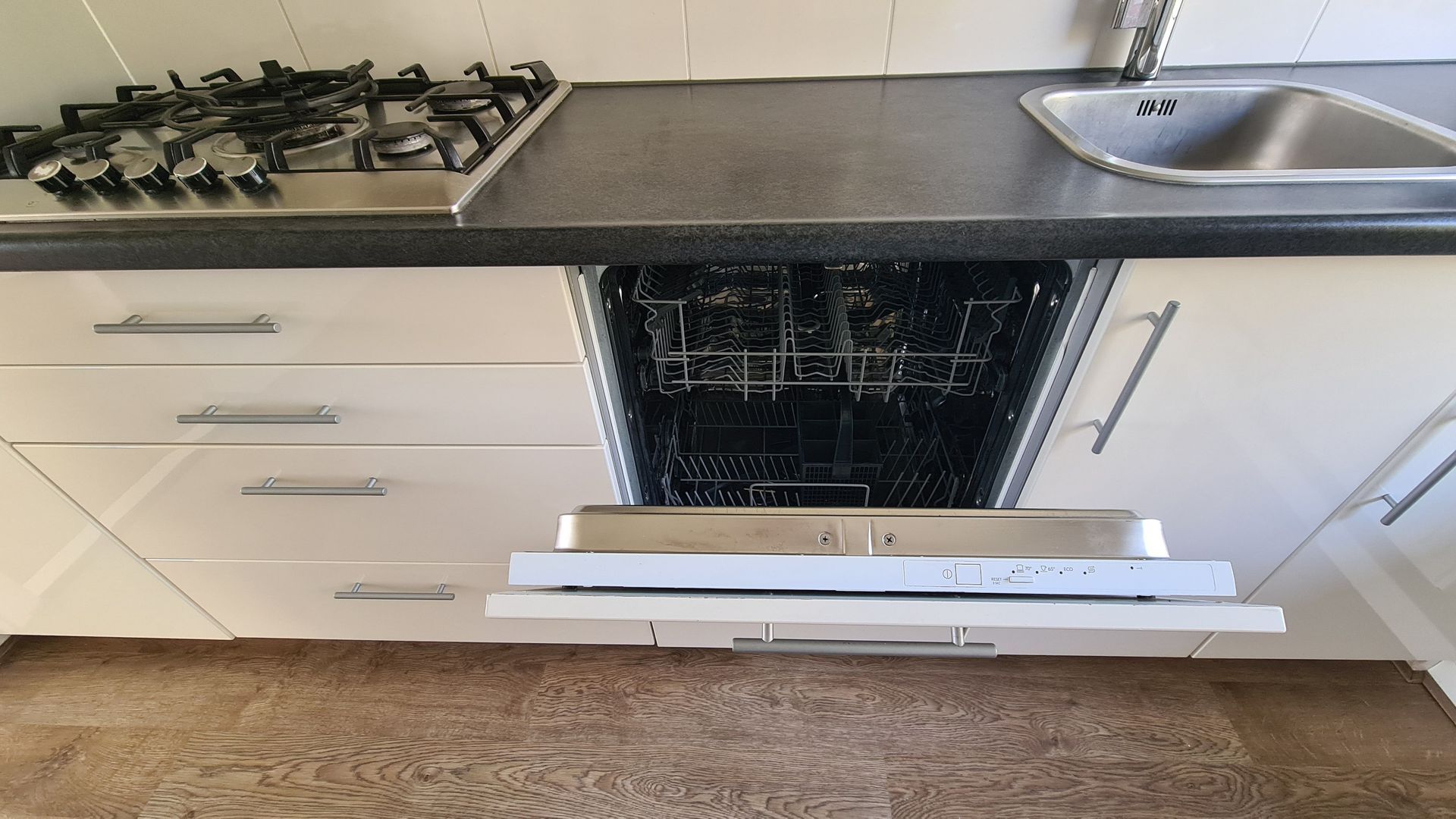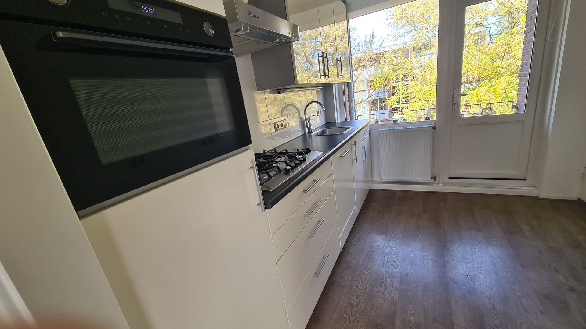 Dichte keuken met inbouwapparatuur zoals 4-pits gaskookplaat, vaatwasser, RVS-afzuigkap en combi-oven. Via de keuken toegang tot het balkon en de badkamer.