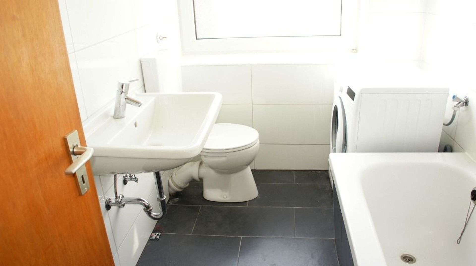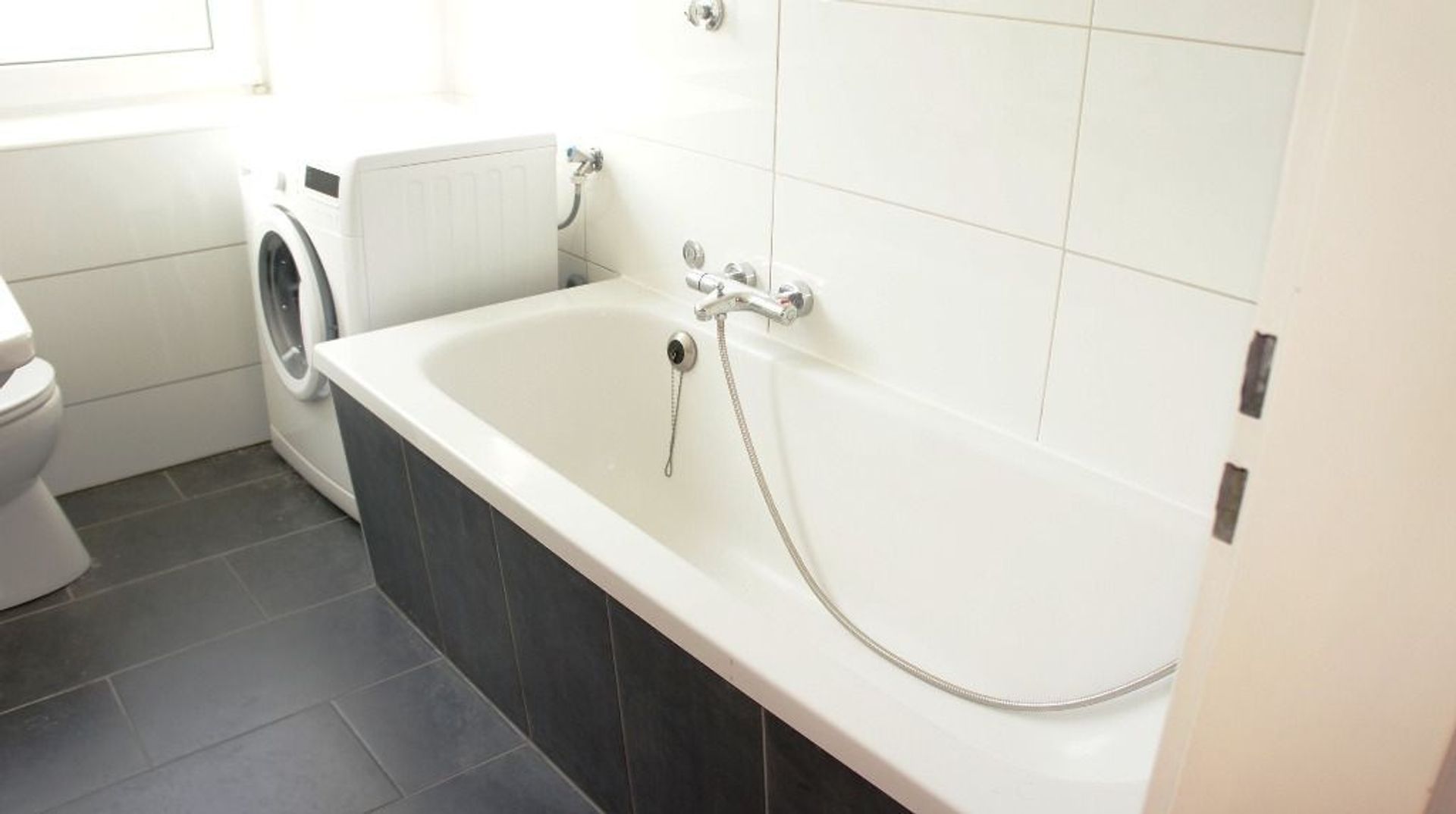 Nieuwe badkamer met ligbad/douche, wastafel, toilet en wasmachineaansluiting.